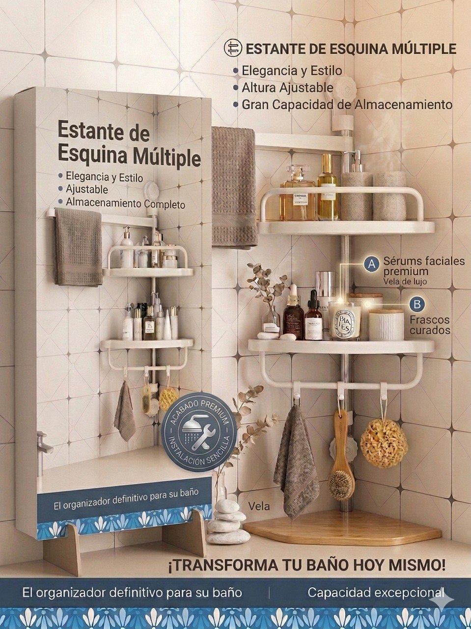 Optimización de Espacio: En baños pequeños, este estante vertical libera los bordes de la tina o las repisas pequeñas que suelen estar saturadas.
