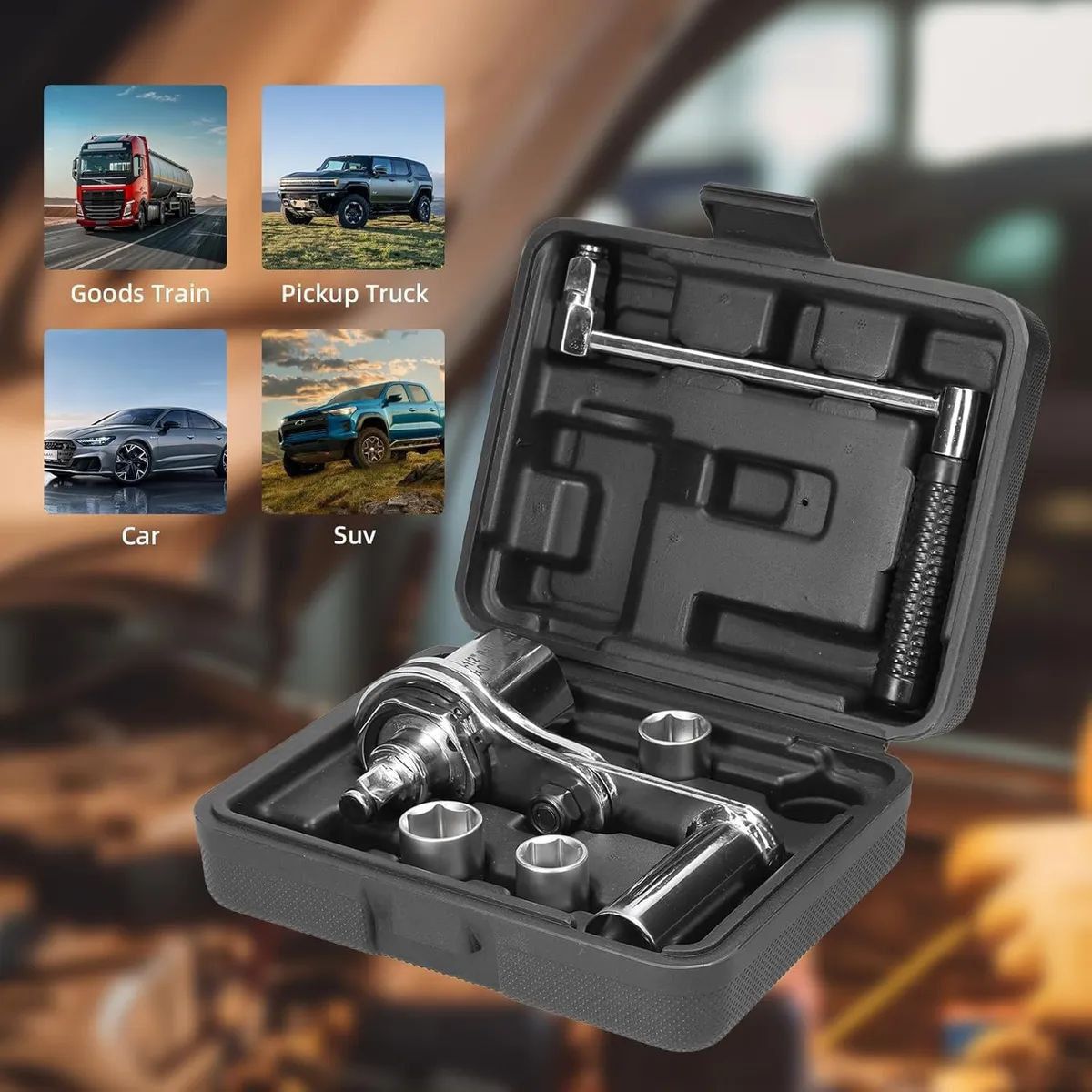 Contenido del kit: Incluye una manivela, una llave multiplicadora y tres dados de medidas comunes (generalmente 17 mm, 19 mm y 21 mm).
