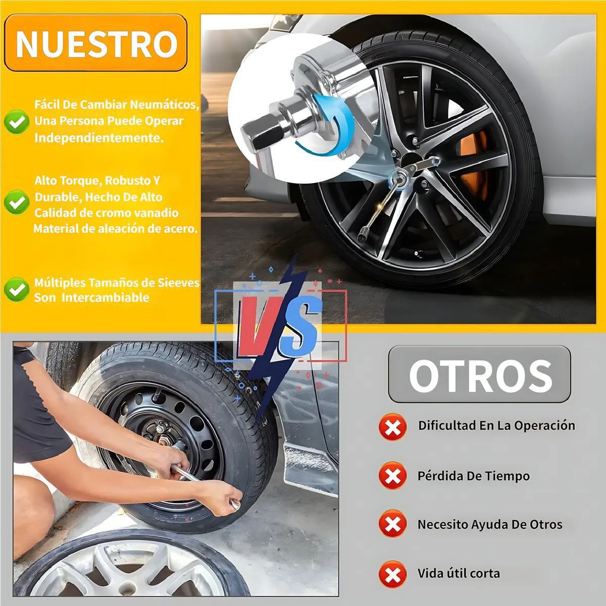 Uso: Ideal para desmontaje de ruedas en emergencias o mantenimiento en taller.
