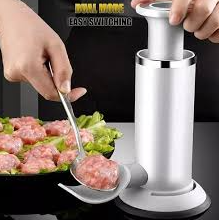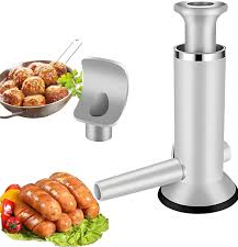 Herramienta de cocina diseñada para la elaboración de salchichas, embutidos y albóndigas de forma casera. Cuenta con un sistema de prensa manual tipo pistón, boquillas intercambiables de diferentes tamaños y una base con ventosa para asegurar la estabilidad durante su uso en superficies lisas.
