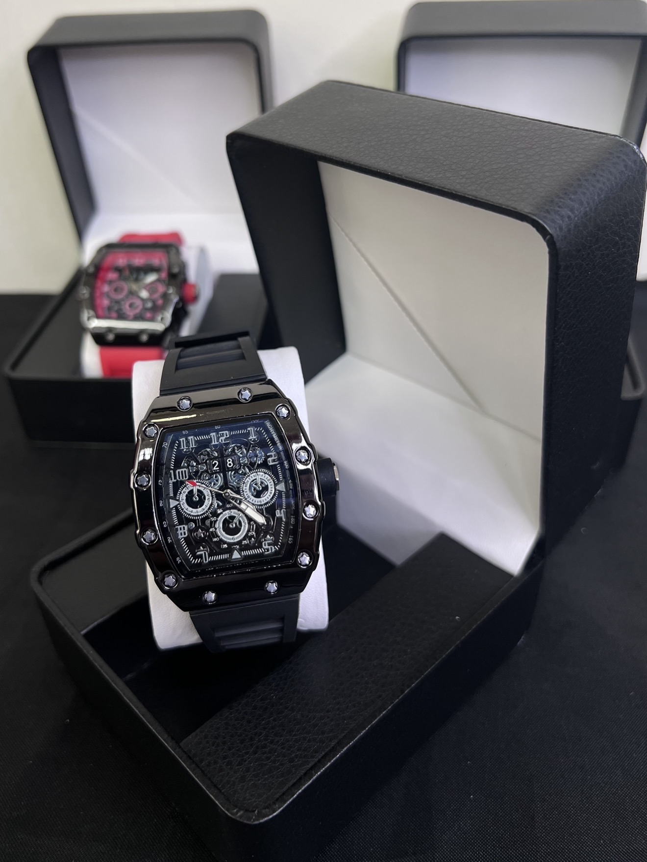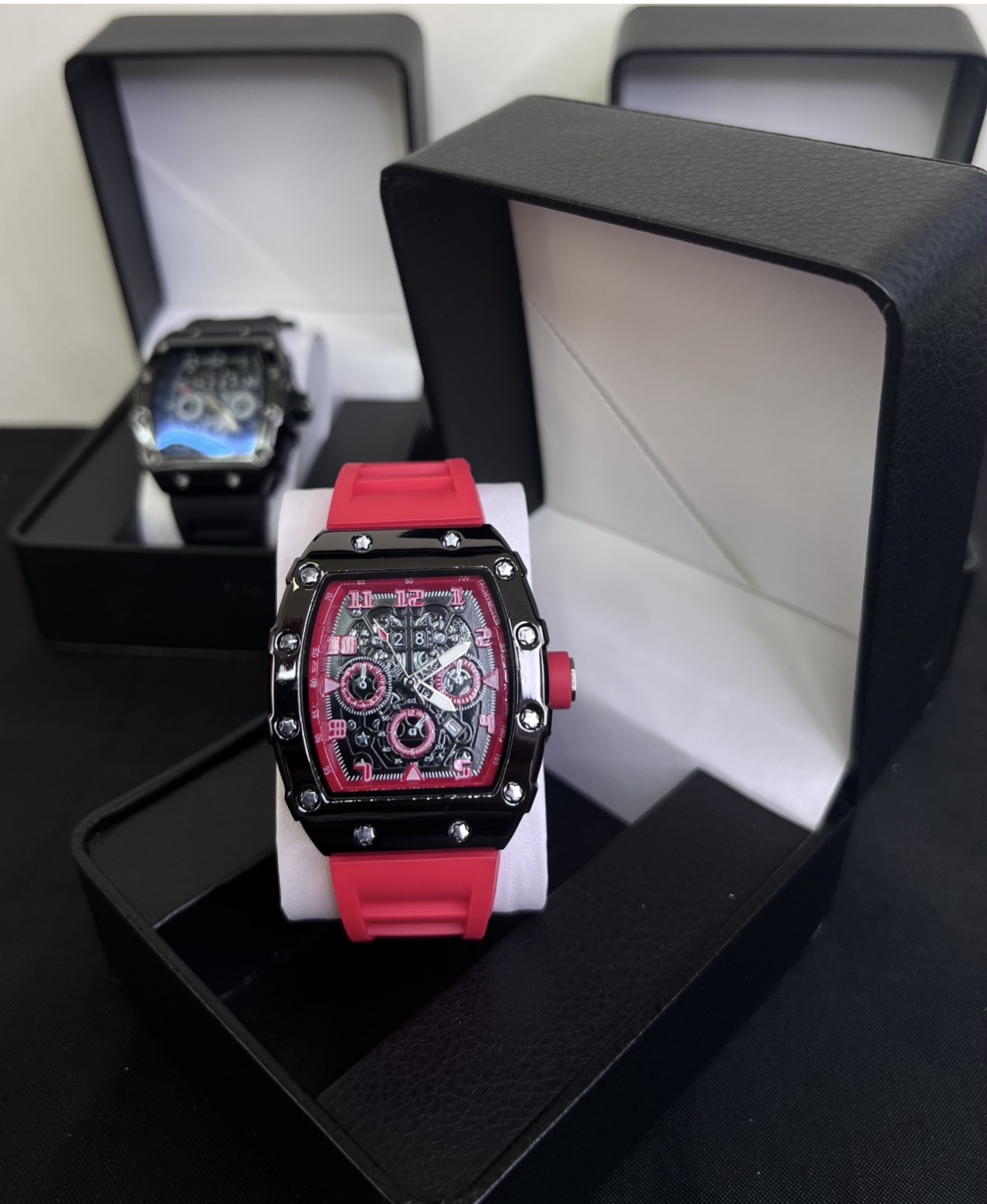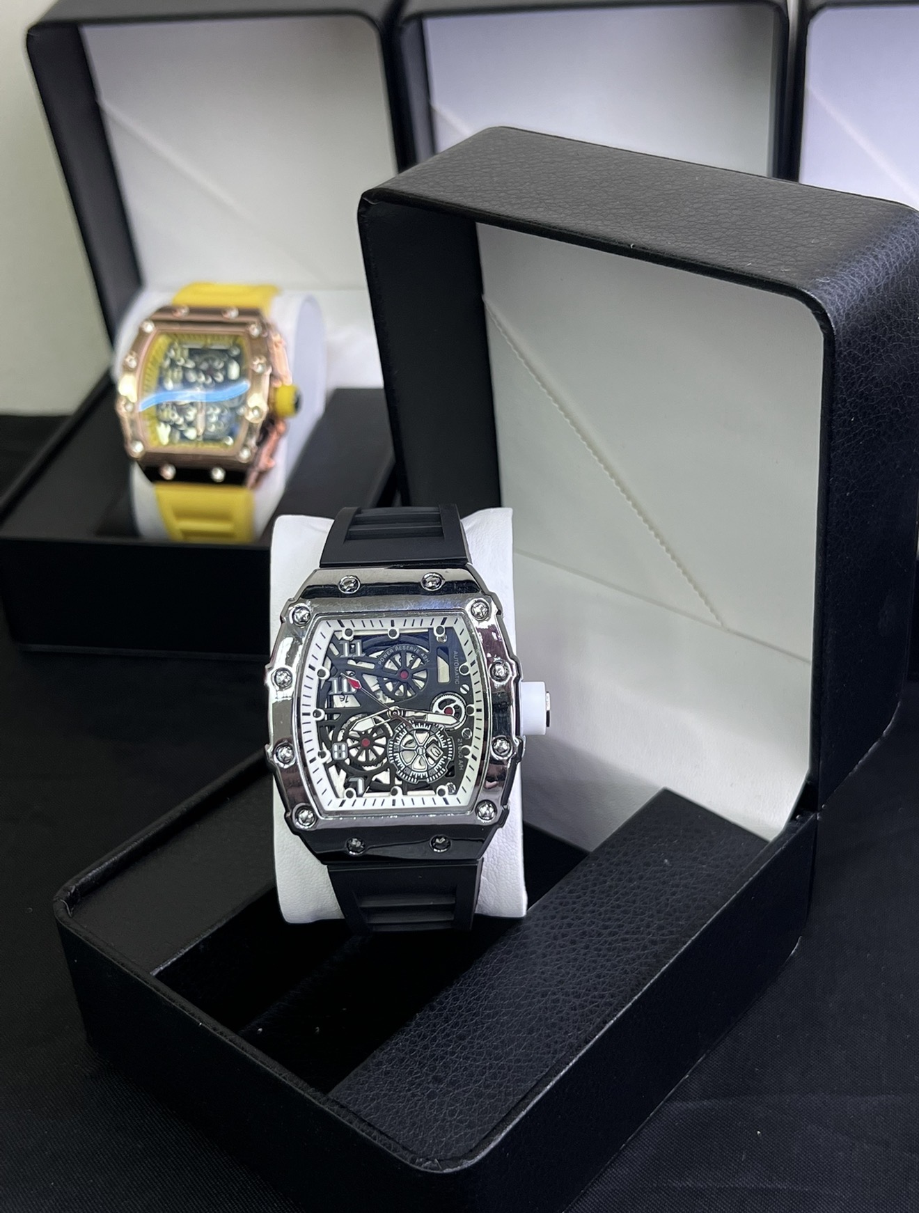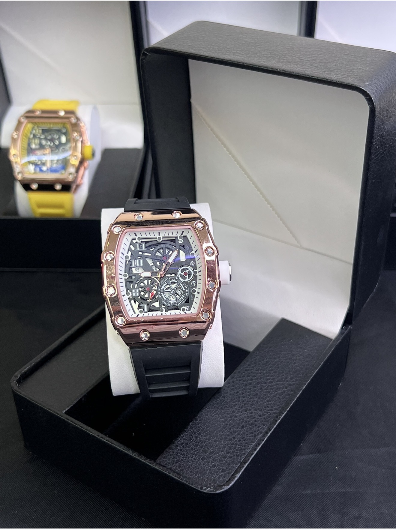 Este reloj tipo skeleton deja ver su mecanismo interno, logrando un look elegante y llamativo que destaca en cualquier ocasión. Su diseño deportivo combina perfectamente con outfits casuales o formales.