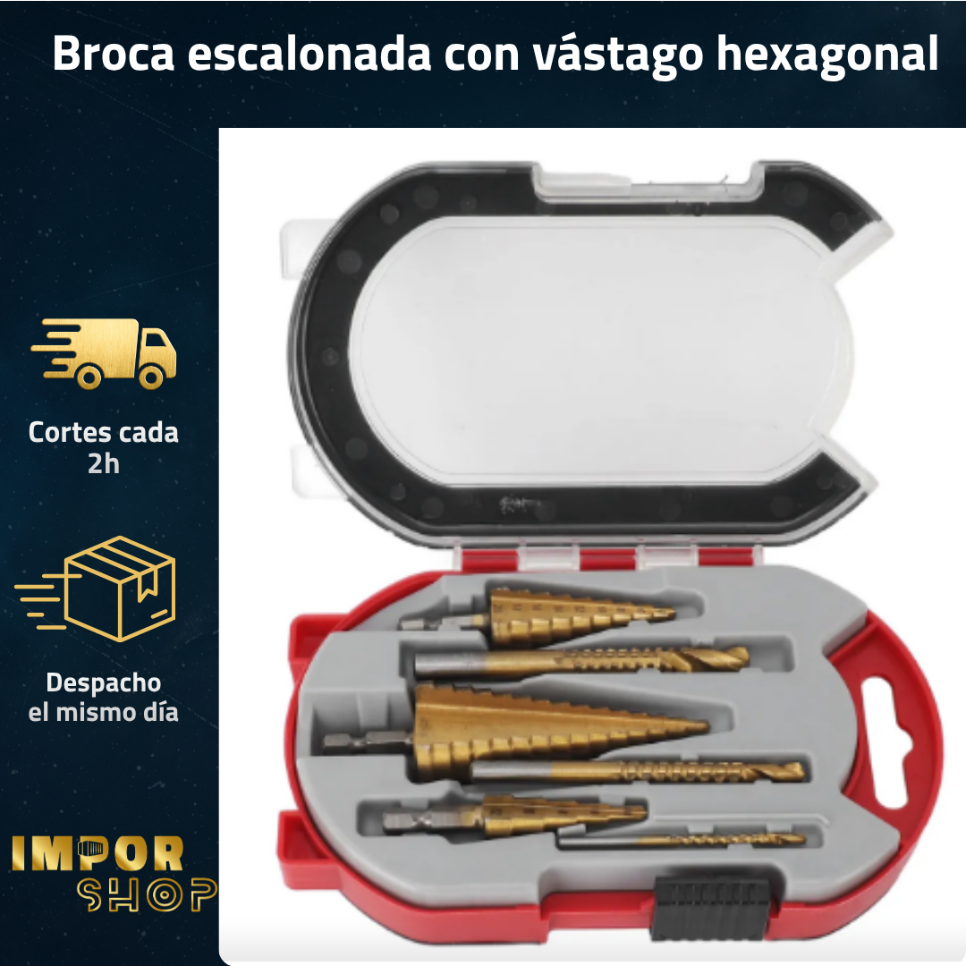¿Cansado de cargar un maletín lleno para un solo trabajo? Con nuestra Broca Escalonada de Titanio, haces huecos de diferentes tamaños sin detenerte.