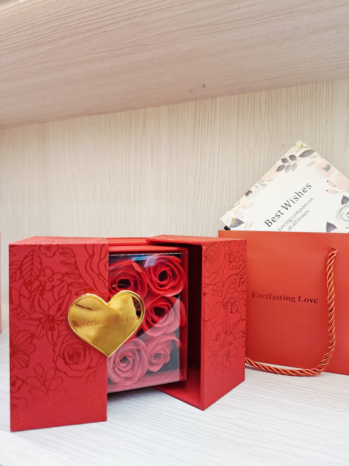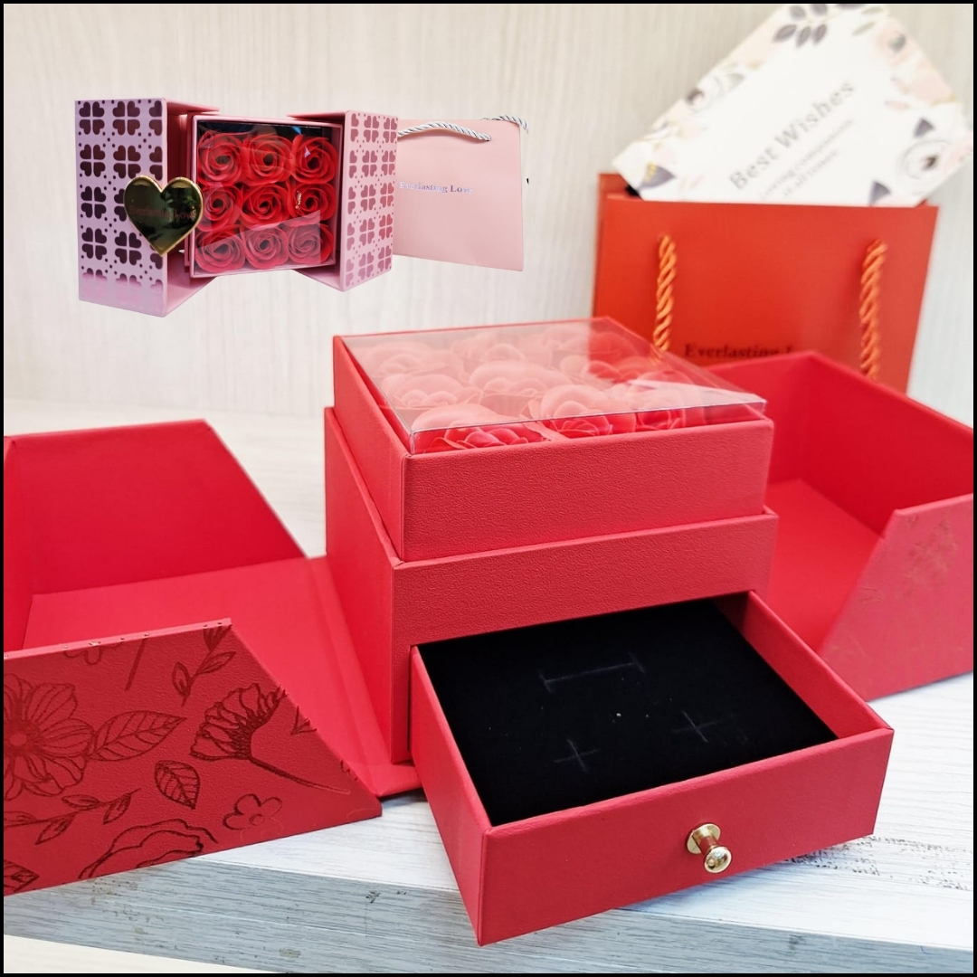• Incluye: Caja con rosas, cajón para joyas, bolsa de lujo y tarjeta de dedicatoria.