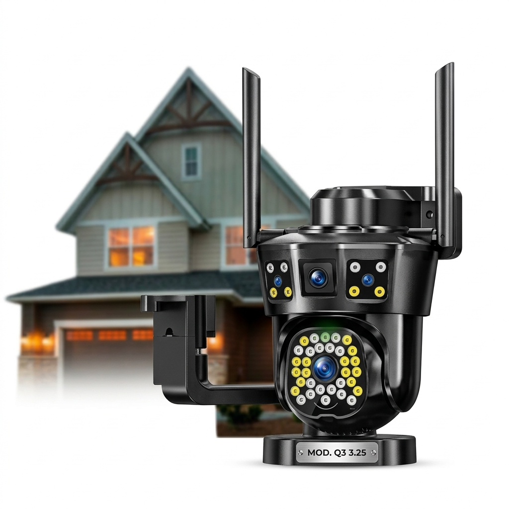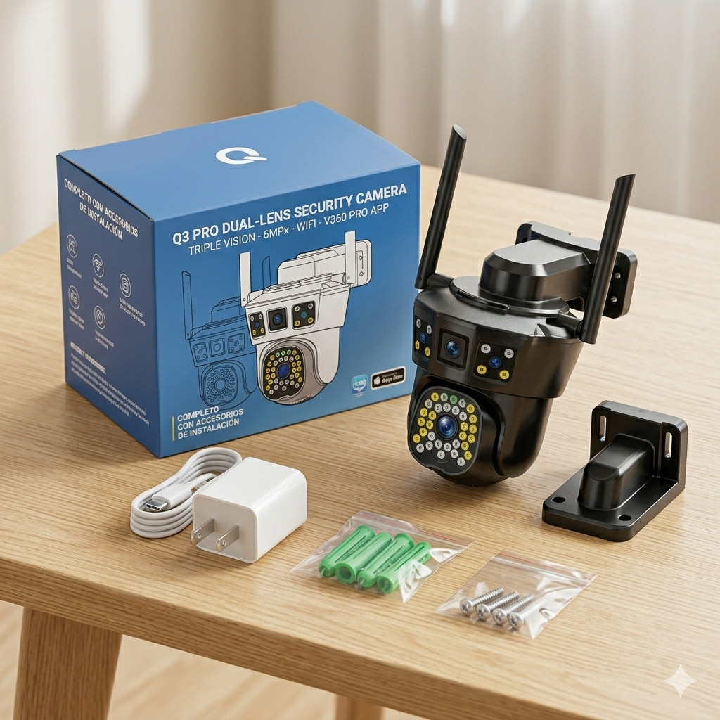​¡Protege lo que más quieres con tecnología de punta! Esta cámara Q3 ofrece una visión panorámica y nítida gracias a su sistema de doble lente.