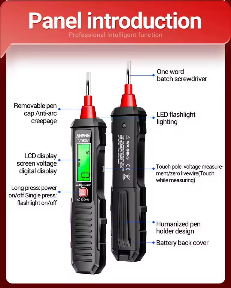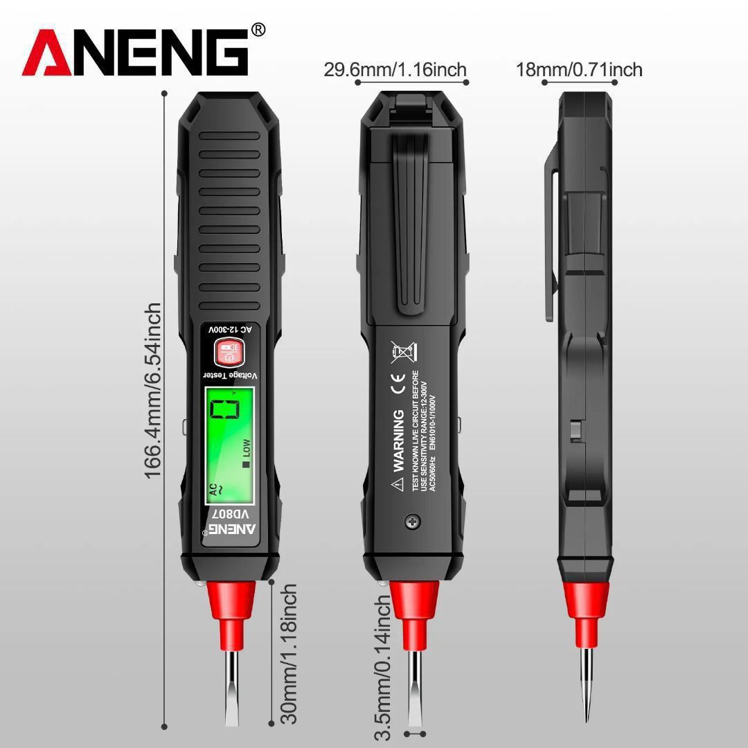 ANENG VD807 Prueba Multifunción Voltaje Pantalla Lápiz Cero / Línea de Fuego Reconocimiento Inteligente LED Linterna Probador de Cables - Negro