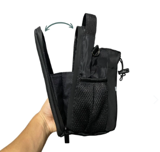 Bolso compacto de tela resistente con compartimento principal de apertura amplia. Incluye bolsillo lateral de malla, correa ajustable y sistema magnético integrado para adherirse a superficies metálicas de máquinas de ejercicio.