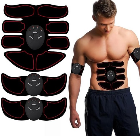Dispositivo de electroestimulación muscular (EMS) que utiliza impulsos eléctricos para contraer los músculos. El set incluye almohadillas adhesivas ergonómicas para la zona abdominal y los brazos, con unidades de control individuales que permiten ajustar diferentes modos e intensidades.