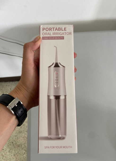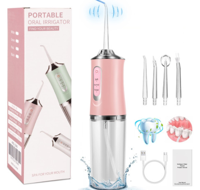 Dispositivo portátil recargable diseñado para la limpieza interdental mediante un chorro de agua a presión. El modelo cuenta con un depósito de agua integrado en la parte inferior y controles frontales para ajustar los modos de uso.