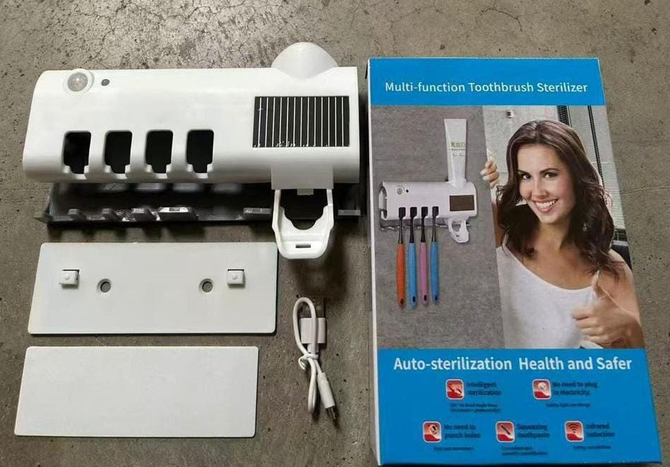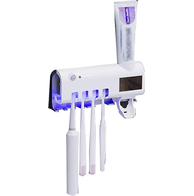 Soporte de pared con capacidad para varios cepillos de dientes que utiliza luz UV. Incorpora un mecanismo dispensador para pasta de dientes y requiere energía eléctrica para su funcionamiento.