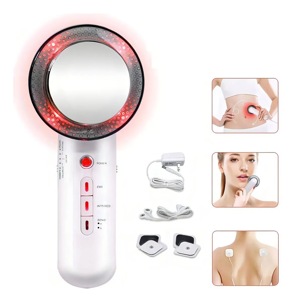 Emite ondas ultrasónicas de 1 MHz para penetrar la dermis y genera calor a través de infrarrojos.
