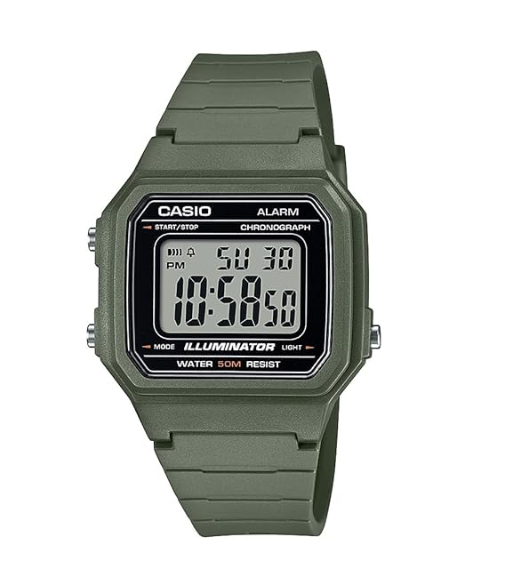 El Casio W-217H es un reloj digital estilo "vintage" con un diseño cuadrado grande y resistente, destacado por su legibilidad, precio accesible y batería de larga duración (aprox. 7 años). Ofrece resistencia al agua de 50m (5 ATM), luz LED, cronómetro de 1/100 seg, alarma diaria y calendario automático, ideal para uso diario.