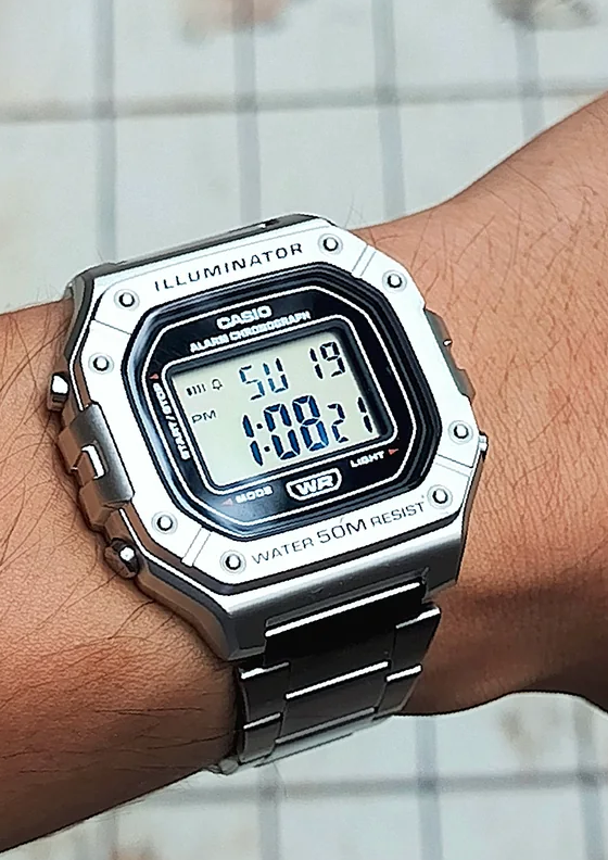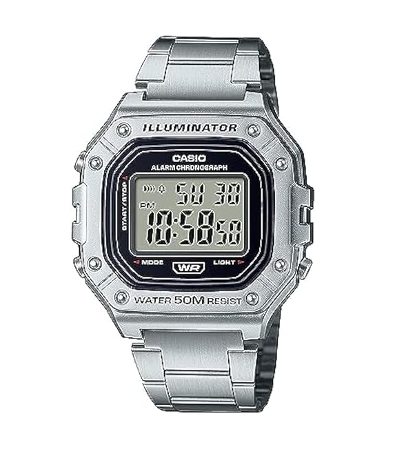 El Casio W-218H es un reloj digital deportivo resistente y ligero, con caja de resina, tapa trasera de acero inoxidable y resistencia al agua de 50 metros (5 BAR). Destaca por su batería de larga duración (aprox. 7 años), luz LED, cronómetro de 1/100 segundos y alarma diaria, ofreciendo un estilo retro-cuadrado versátil. Características Principales: Diseño: Estilo cuadrado, deportivo y ergonómico, a menudo comparado con la serie G-Shock por su estética resistente. Materiales: Caja de resina, tapa trasera atornillada de acero inoxidable (asegura mayor durabilidad) y vidrio de resina. Dimensiones: Tamaño aproximado de y peso ligero de 37 gramos. Funciones: Luz LED: Iluminación para condiciones de poca luz. Cronómetro: Capacidad de medición de 1/100 segundos, ideal para deportes. Alarma/Señal horaria: Alarma diaria programable. Calendario: Automático (configurado para febrero con días diferentes, requiere ajuste manual). Resistencia al agua: 50 metros (5 ATM), apto para nadar o ducharse. Batería: Larga duración, con una vida útil estimada de hasta 7 años