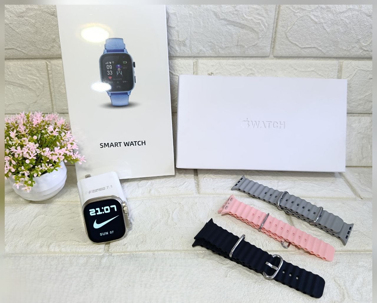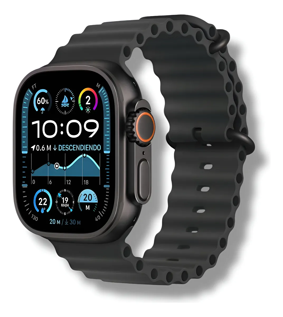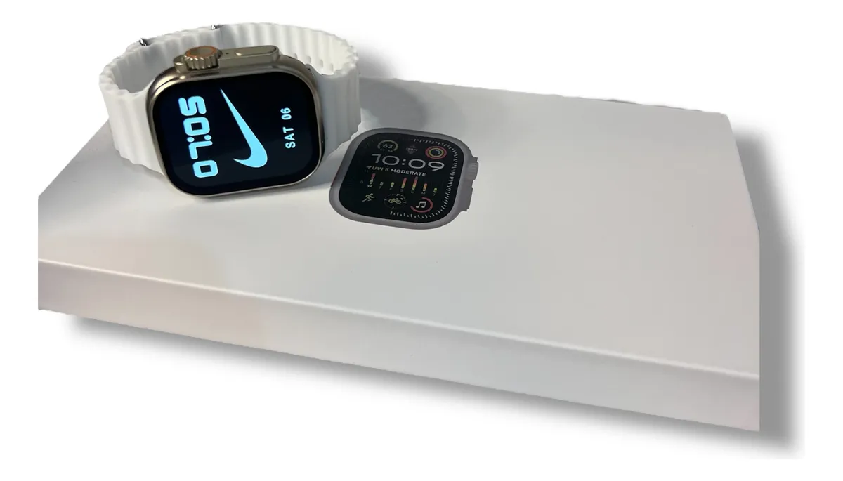 reloj inteligente (smartwatch) estilo réplica, comercializado en un paquete que incluye correas intercambiables.