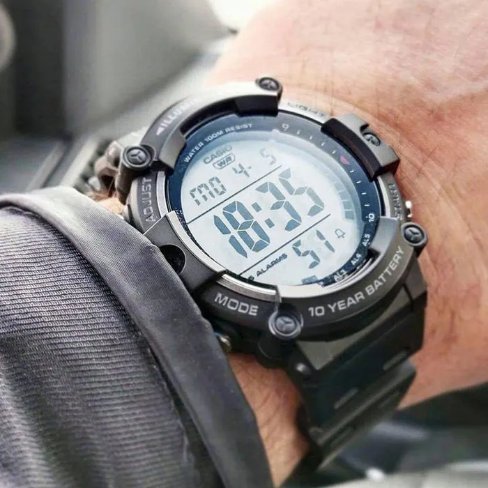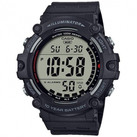 El Casio AE-1500 es un reloj digital de estilo robusto (similar a G-Shock) conocido por su gran pantalla LCD de fácil lectura, excelente relación calidad-precio y una batería de larga duración. Destaca por su resistencia al agua de 100 metros, cronómetro, 5 alarmas y un diseño ligero de resina. Características Principales del Casio AE-1500 Original: Batería de larga duración: Aproximadamente 10 años de autonomía (batería CR2032). Resistencia al agua: 100 metros (10 ATM / 10 bar), apto para natación y uso diario. Pantalla y Diseño: Pantalla LCD de gran tamaño (diseño amplio). Diseño estilo protrek o G-Shock con caja de resina y cristal acrílico protegido por el bisel. Funciones: Cronómetro de 1/100 segundos. Hora dual (ideal para viajes). 5 alarmas multifunción. Temporizador de cuenta regresiva (hasta 24 horas). Calendario automático completo (hasta el año 2099). Iluminación: Luz LED (Illuminator). Dimensiones y Peso: Caja de resina de 54.4 mm × 51.2 mm × 15.7 mm y peso ligero de aproximadamente 57 g